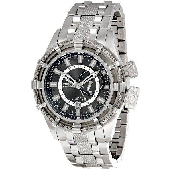 Silver-tone 316l stainless steel case with a stainless steel bracelet. Gunmetal-plated wire cable bezel. Black sunray dial with skeletal hands and index hour markers. Minute markers around the outer rim. Date display appears at the 6 o'clock position. Swiss isa 8176 quartz GMT movement. Scratch resistant mineral crystal. Knurled textured crown. Case diameter: 50 mm. Case thickness: 15 mm. Deployment clasp. Water resistant at 200 meters / 660 feet. Functions: hours, minutes, seconds, calendar. Invicta Signature Bolt Swiss GMT Watch 7250.