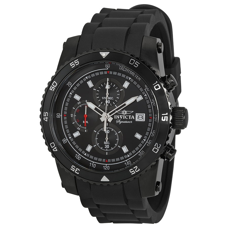 Black ion-plated stainless steel case with a black rubber strap. Uni-directional rotating black ion-plated bezel. Black dial with silver-tone hands and index hour markers. Minute markers, tachymeter around the outer rim. Dial Type: Analog. Luminescent hands and markers. Date display at the 3 o'clock position. Chronograph - three sub-dials displaying: 60 second, 60 minute and 1/10th of a second. Caliber 5050.E2 quartz movement. Scratch resistant flame fusion crystal. Pull / push crown. Solid case back. Case size: 45mm. Case thickness: 12mm. Round case shape. Band width: 22 mm. Deployment clasp with a push button release. Water resistant at 50 meters / 165 feet. Functions: chronograph, date, hour, minute, second, tachymeter. Additional Info: this watch comes with an extra strap. Casual watch style. Invicta Signature II Chronograph Black Dial Mens Watch 7454.