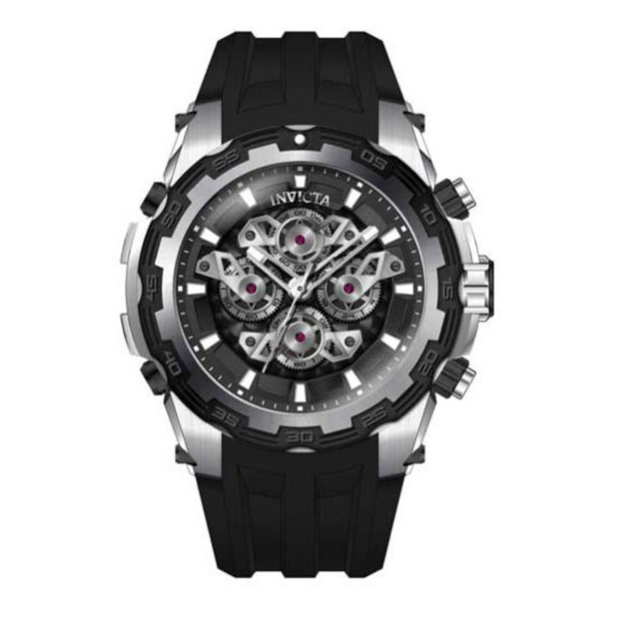 Communicating time with ingenious innovation the Invicta Specialty Collection is the shining example of invention in motion. This collection captures the revelation of intuition in transcendent pieces that better depict the very nature of time. Acclaimed for unique designs stellar movements and superior craftsmanship Invicta Specialty inhabits the cusp of horology where creative minds turn complications into challenges and make history one masterpiece at a time. Silver-tone stainless steel case with a black silicone strap. Fixed black and silver-tone stainless steel bezel. Black dial with silver-tone hands and index hour markers. Minute markers around the outer rim. Dial Type: Analog. Luminescent hands and markers. Chronograph - four sub-dials displaying: 60 second, 30 minute and 1/10th of a second, 24 hour. Hattori Caliber VD56 quartz movement. Scratch resistant Flame Fusion crystal. Pull / push crown. Solid case back. Round case shape, case size: 50 mm, case thickness: 15.6 mm. Band width: 32 mm, band length: 7.75 inches. Buckle clasp. Water resistant at 100 meters / 330 feet. Functions: chronograph, GMT, second time zone, hour, minute, second. Specialty Series. Sport watch style. Watch label: Japan Movt. Invicta Specialty Chronograph Quartz Black Dial Mens Watch 34214.