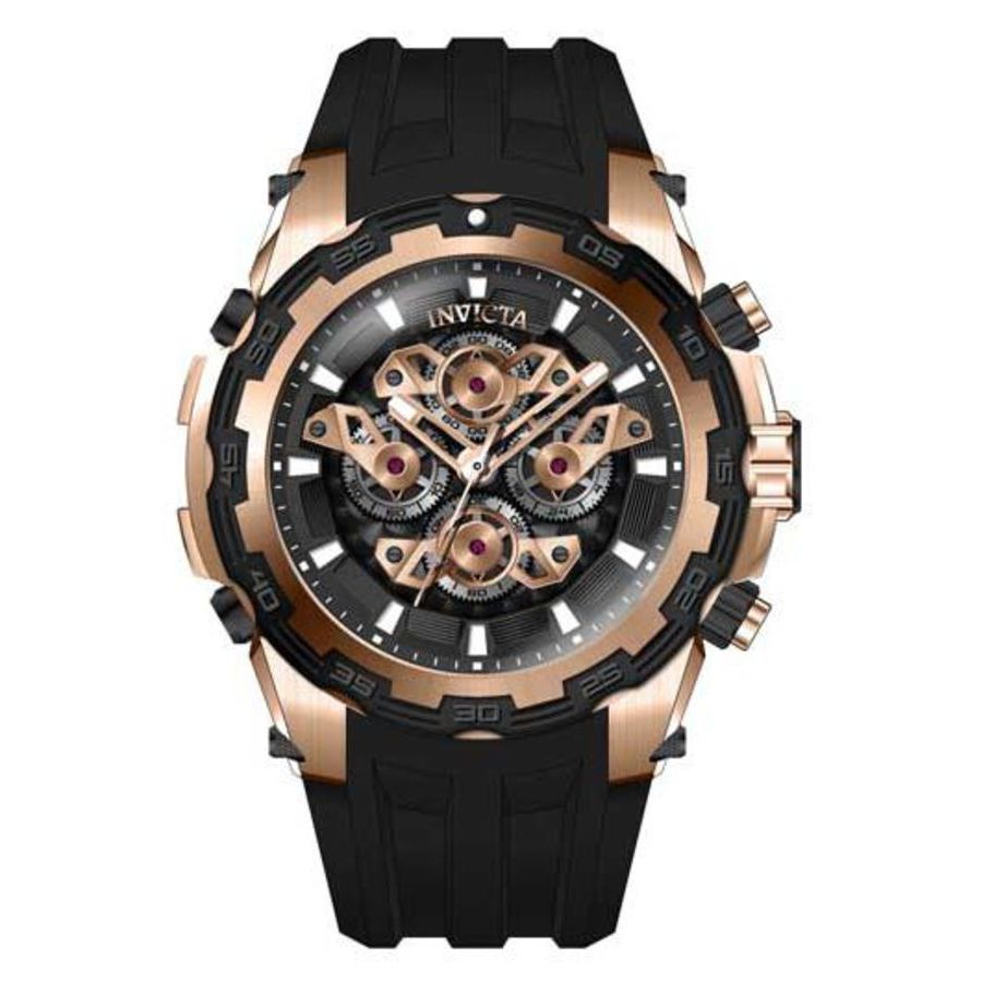 Communicating time with ingenious innovation the Invicta Specialty Collection is the shining example of invention in motion. This collection captures the revelation of intuition in transcendent pieces that better depict the very nature of time. Acclaimed for unique designs stellar movements and superior craftsmanship Invicta Specialty inhabits the cusp of horology where creative minds turn complications into challenges and make history one masterpiece at a time. Rose gold-tone stainless steel case with a black silicone strap. Fixed black and rose gold stainless steel bezel. Black dial with rose gold-tone hands and index hour markers. Minute markers around the outer rim. Dial Type: Analog. Luminescent hands and markers. Chronograph - four sub-dials displaying: 60 second, 30 minute and 1/10th of a second, 24 hour. Hattori Caliber VD56 quartz movement. Scratch resistant Flame Fusion crystal. Pull / push crown. Solid case back. Round case shape, case size: 50 mm, case thickness: 15.6 mm. Band width: 32 mm, band length: 7.75 inches. Buckle clasp. Water resistant at 100 meters / 330 feet. Functions: chronograph, GMT, second time zone, hour, minute, second. Specialty Series. Sport watch style. Watch label: Japan Movt. Invicta Specialty Chronograph Quartz Black Dial Mens Watch 34217.