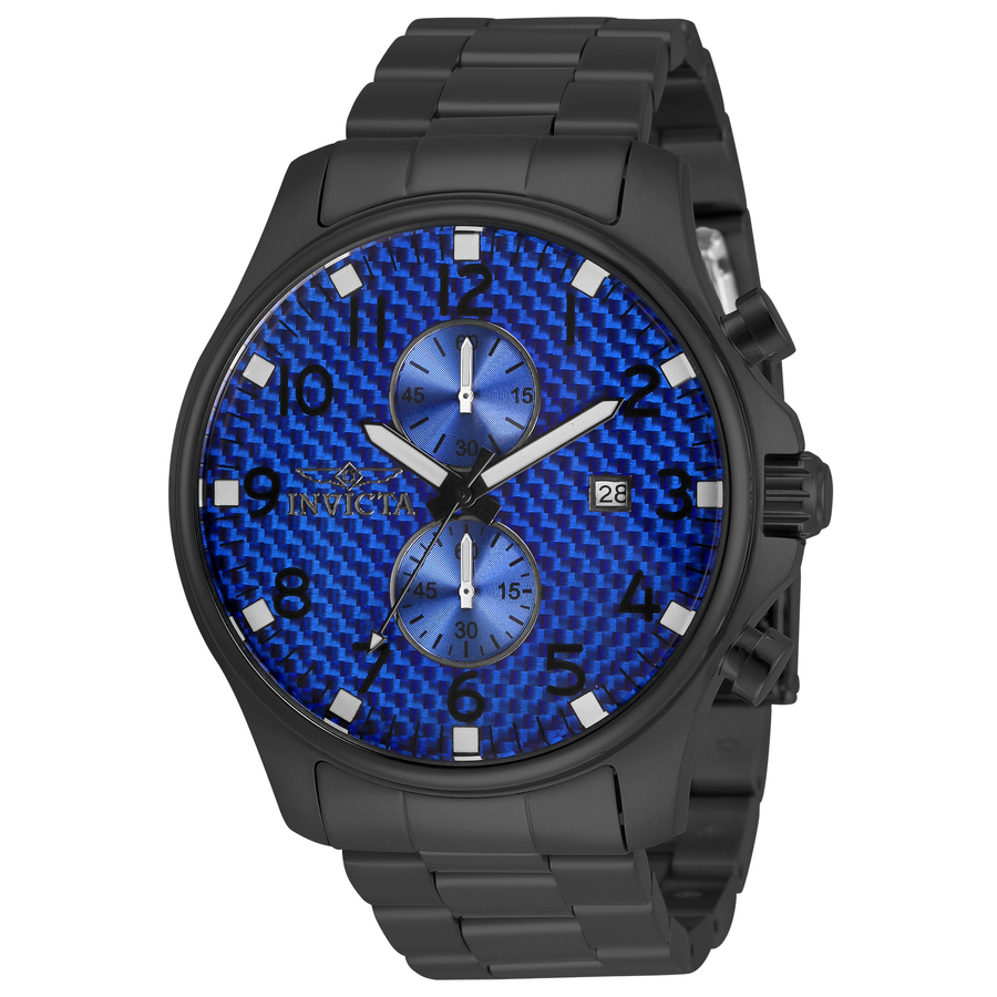 Black stainless steel case and bracelet. Fixed black stainless steel bezel. Blue dial with black hands and index hour markers. Dial Type: Analog. Luminescent hands and markers. Date display at the 3 o'clock position. Chronograph - two sub-dials displaying: 60 second and 60 minute. Hattori Caliber VD51 quartz movement. Scratch resistant Flame Fusion crystal. Pull / push crown. Solid case back. Round case shape, case size: 48 mm, case thickness: 12 mm. Band width: 24 mm, band length: 7.25 inches. Fold over clasp. Water resistant at 100 meters / 330 feet. Functions: chronograph, date, hour, minute, second. Specialty Series. Casual watch style. Watch label: Japan Movt. Invicta Specialty Chronograph Quartz Blue Dial Mens Watch 34033.