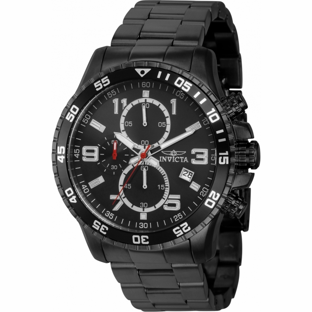 Black-plated stainless steel case and bracelet. Uni-directional rotating black-plated bezel. Black dial with luminous silver-tone hands and alternating Arabic numeral and index hour markers. Minute markers around the outer rim. Dial Type: Analog. Luminescent hands and markers. Date display at the 4 o'clock position. Chronograph - three sub-dials displaying: 60 second, 60 minute and 1/10th of a second. Hattori caliber VD57 quartz movement. Scratch resistant Flame Fusion crystal. Pull / push crown. Solid case back. Round case shape. Case size: 45 mm. Case thickness: 12.5 mm. Band width: 22 mm. Band length: 7.75 inches. Fold over clasp. Water resistant at 50 meters / 165 feet. Functions: chronograph, date, hour, minute, second. Specialty Series. Casual watch style. Watch label: Japan Movt. Invicta Specialty Chronograph Quartz Black Dial Mens Watch 36985.