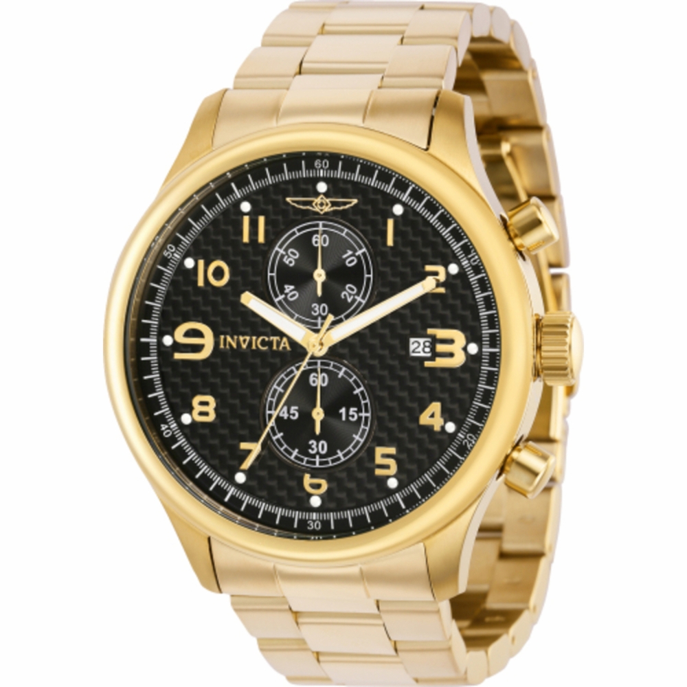 Gold-tone stainless steel case and bracelet. Fixed gold-tone stainless steel bezel. Black dial with gold-tone hands and Arabic numeral hour markers. Minute markers around the outer rim. Dial Type: Analog. Luminescent hands and markers. Date display at the 4 o'clock position. Chronograph - two sub-dials displaying: 60 second and 60 minute. Hattori Caliber VD51 quartz movement. Scratch resistant Flame Fusion crystal. Pull / push crown. Solid case back. Round case shape, case size: 48 mm. Band width: 24 mm. Fold over clasp with a safety release. Water resistant at 100 meters / 330 feet. Functions: chronograph, date, hour, minute, second. Specialty Series. Sport watch style. Watch label: Japan Movt. Invicta Specialty Chronograph Quartz Black Dial Mens Watch 38026.