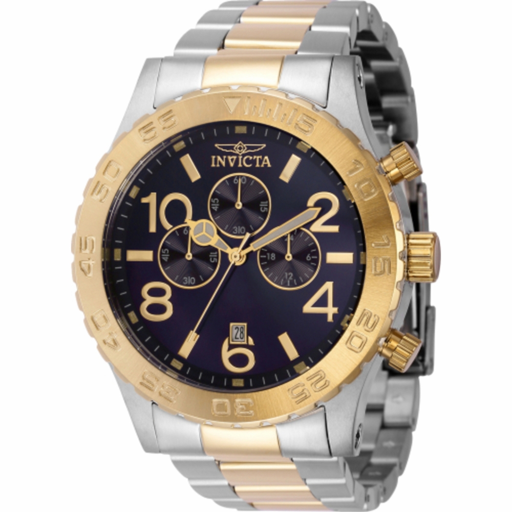 Silver-tone stainless steel case with a two-tone (gold and silver-tone) stainless steel bracelet. Gold-tone stainless steel bezel. Blue dial with gold-tone hands and index-Arabic numeral hour markers. Minute markers around the outer rim. Dial Type: Analog. Luminescent hands. Date display at the 6 o'clock position. Chronograph - three sub-dials displaying: 60 second, 60 minute and 24 hour. SII Caliber VD52 quartz movement. Scratch resistant mineral crystal. Pull / push crown. Solid case back. Round case shape, case size: 50 mm, case thickness: 12.5 mm. Band width: 26 mm, band length: 8.50 inches. Fold over safety clasp. Water resistant at 50 meters / 165 feet. Functions: chronograph, date, hour, minute, second. Specialty Series. Sport watch style. Watch label: Japan Movt. Invicta Specialty Chronograph Quartz Blue Dial Mens Watch 40603.
