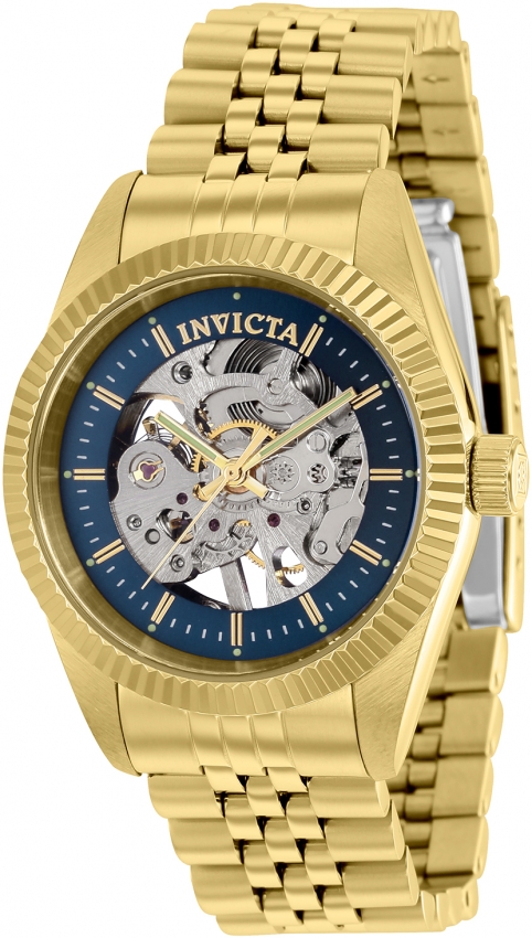 Yellow gold-tone stainless steel case and bracelet. Fixed yellow gold-tone bezel. Blue (skeleton center) dial with luminous yellow gold-tone hands and index hour markers. Minute markers around the outer rim. Dial Type: Analog. Luminescent hands and markers. Caliber P2650-SS hand wind movement. Scratch resistant mineral crystal. Pull / push crown. Transparent case back. Round case shape. Case size: 36 mm. Case thickness: 11.1 mm. Band width: 18 m. Band length: 7.75 inches. Fold over clasp. Water resistant at 50 meters / 165 feet. Functions: hour, minute, second. Specialty Series. Dress watch style. Invicta Specialty Hand Wind Blue Skeleton Dial Ladies Watch 36453.