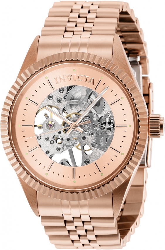 Rose gold-tone stainless steel case and bracelet. Fixed rose gold-tone bezel. Rose (skeleton center) dial with luminous rose gold-tone hands and index hour markers. Minute markers. Dial Type: Analog. Luminescent hands and markers. Caliber P2650-SS hand wind movement. Scratch resistant mineral crystal. Pull / push crown. Transparent case back. Round case shape. Case size: 43 mm. Band width: 22 mm. Fold over clasp. Water resistant at 50 meters / 165 feet. Functions: hour, minute, second. Specialty Series. Casual watch style. Invicta Specialty Hand Wind Rose Gold-tone Skeleton Dial Mens Watch 36445.