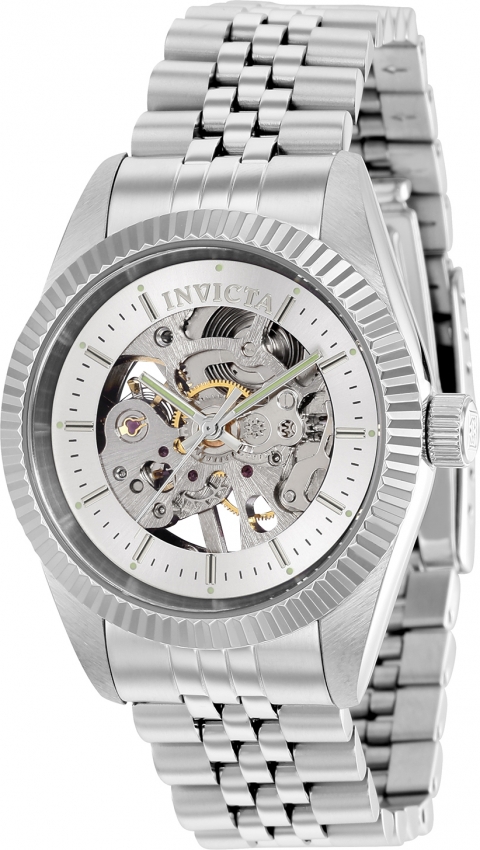 Stainless steel case with a 1 stainless steel bracelet. Fixed fluted stainless steel bezel. Silver (skeleton center) dial with luminous silver-tone hands and index hour markers. Minute markers around the outer rim. Dial Type: Analog. Luminescent hands and markers. Caliber P2650-SS hand wind movement. Scratch resistant mineral crystal. Pull / push crown. Transparent case back. Round case shape. Case size: 36 mm. Case thickness: 11.1 mm. Band width: 18 mm. Band length: 7.75 inches. Fold over clasp. Water resistant at 50 meters / 165 feet. Functions: hour, minute, second. Specialty Series. Dress watch style. Invicta Specialty Hand Wind Silver-tone Skeleton Dial Ladies Watch 36446.