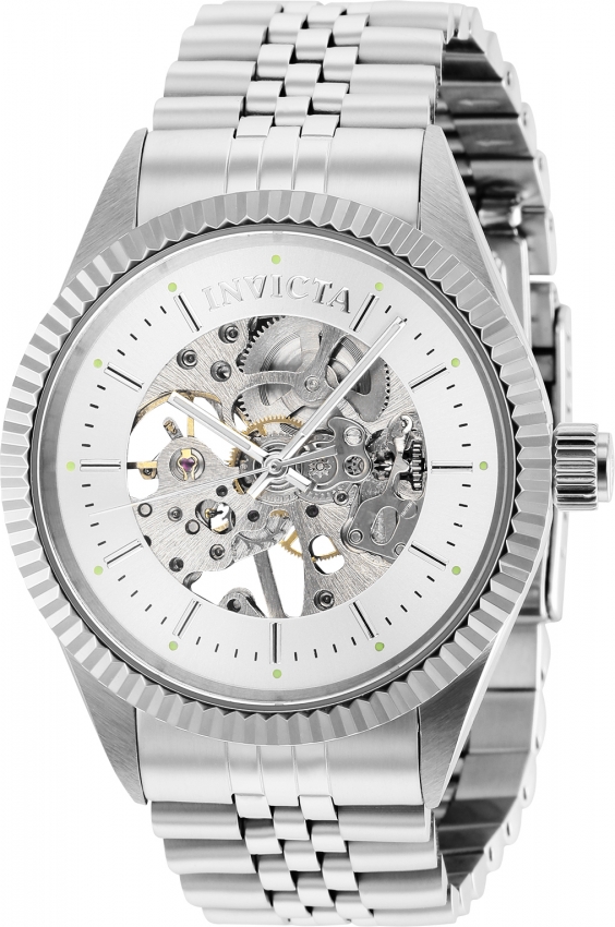 Stainless steel case with a stainless steel bracelet. Fixed fluted stainless steel bezel. White (skeleton center) dial with luminous silver-tone hands and index hour markers. Minute markers around the outer rim. Dial Type: Analog. Luminescent hands and markers. Caliber P2650-SS hand wind movement. Scratch resistant mineral crystal. Pull / push crown. Transparent case back. Round case shape. Case size: 43 mm. Case thickness: 12 mm. Band width: 22 mm. Fold over clasp. Water resistant at 50 meters / 165 feet. Functions: hour, minute, second. Specialty Series. Casual watch style. Invicta Specialty Hand Wind White Skeleton Dial Mens Watch 36436.