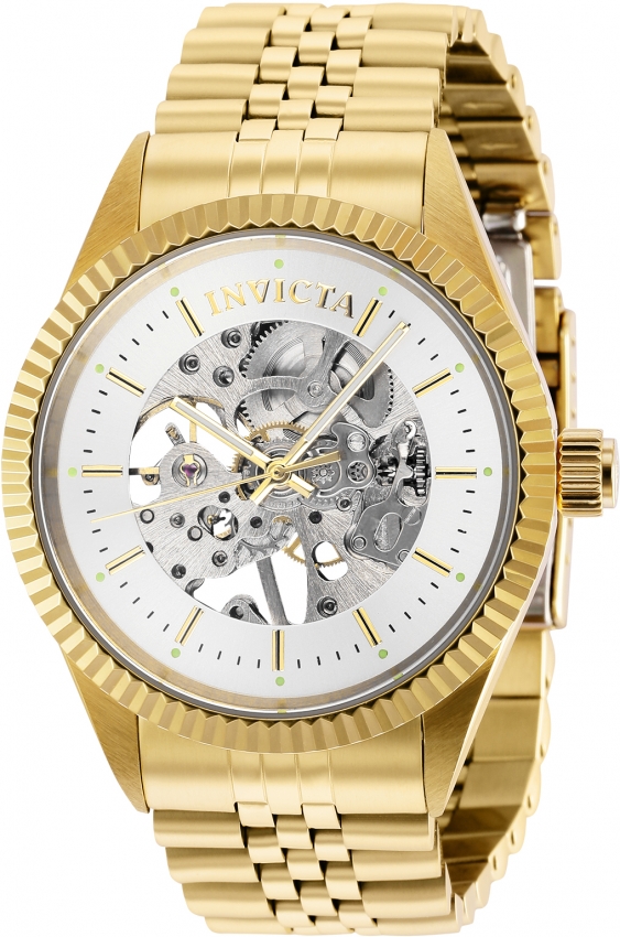 Yellow gold-tone stainless steel case and bracelet. Fixed fluted yellow gold-tone bezel. White (skeleton center) dial with luminous yellow gold-tone hands and index hour markers. Minute markers around the outer rim. Dial Type: Analog. Luminescent hands and markers. Caliber P2650-SS hand wind movement. Scratch resistant mineral crystal. Pull / push crown. Transparent case back. Round case shape. Case size: 43 mm. Case thickness: 12 mm. Band width: 22 mm. Band length: 205 mm. Fold over clasp. Water resistant at 50 meters / 165 feet. Functions: hour, minute, second. Specialty Series. Casual watch style. Invicta Specialty Hand Wind White Skeleton Dial Mens Watch 36441.