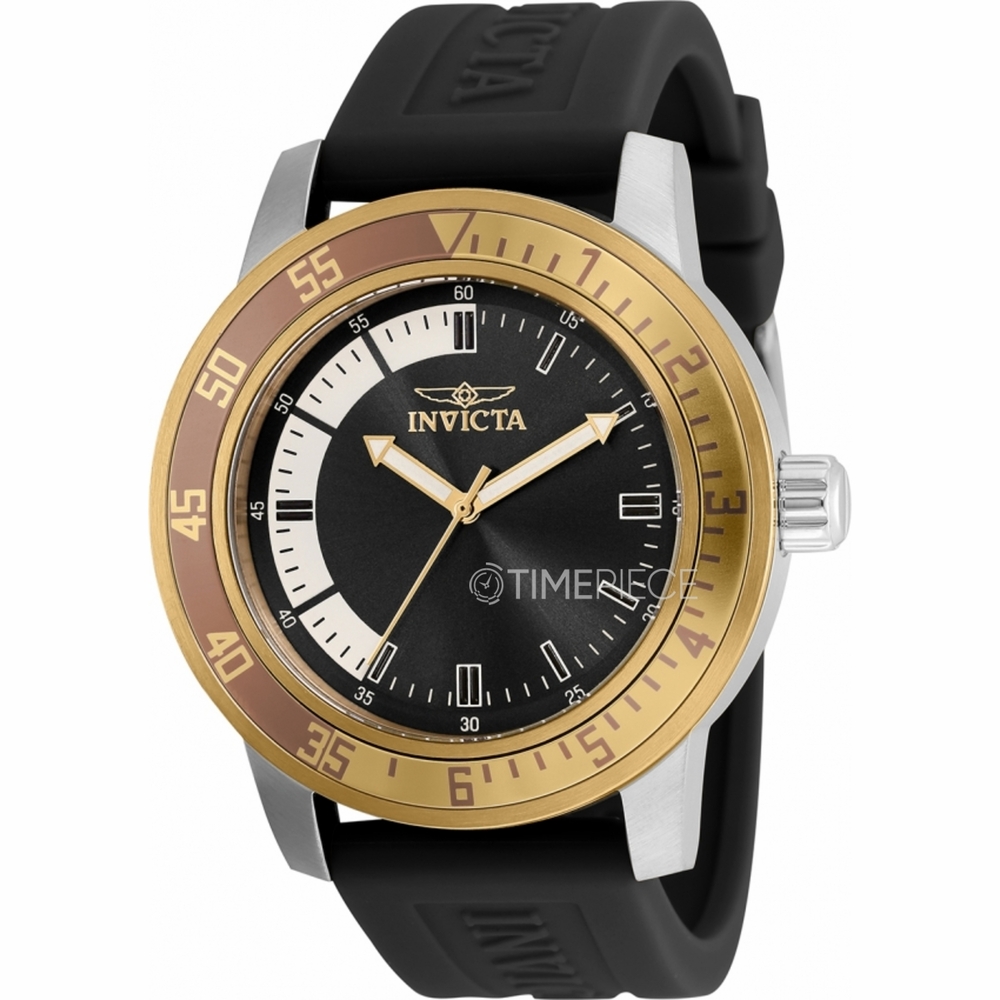 Silver-tone stainless steel case with a black silicone strap. Fixed two-tone (light brown and gold) stainless steel bezel. Black dial with gold-tone hands and index hour markers. Minute markers around the outer rim. Dial Type: Analog. Luminescent hands. TMI Caliber PC21J quartz movement. Scratch resistant Flame Fusion crystal. Screw down crown. Solid case back. Round case shape, case size: 45 mm, case thickness: 12.5 mm. Band width: 22 mm, band length: 9.25 inches. Buckle clasp. Water resistant at 100 meters / 330 feet. Functions: hour, minute, second. Specialty Series. Casual watch style. Watch label: Japan Movt. Invicta Specialty Quartz Black Dial Mens Watch 35680.