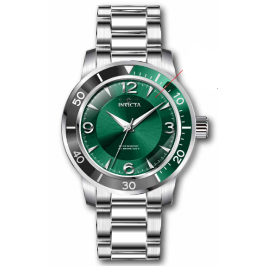 Stainless steel case with a stainless steel bracelet. Fixed stainless steel bezel with an inlaid black and green ring. Green dial with luminous silver-tone hands and index hour markers. Arabic numeral marker appears at the 3, 6, 9 and 12 o'clock positions. Minute markers around the outer rim. Dial Type: Analog. Luminescent hands. Hattori caliber PC21 quartz movement. Scratch resistant Flame Fusion crystal. Pull / push crown. Solid case back. Round case shape. Case size: 45 mm. Case thickness: 18 mm. Band width: 22 mm. Band length: 7.50 inches. Fold over clasp. Water resistant at 100 meters / 330 feet. Functions: hour, minute, second. Specialty Series. Casual watch style. Watch label: Japan Movt. Invicta Specialty Quartz Green Dial Mens Watch 38519.