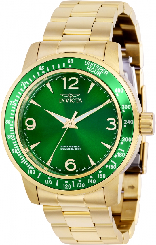 Green stainless steel case with a gold-tone stainless steel bracelet. Fixed tachymeter scale green stainless steel bezel. Green dial with gold-tone hands and index-Arabic numeral hour markers. Minute markers around the outer rim. Dial Type: Analog. Luminescent hands. Hattori Caliber PC21 quartz movement. Scratch resistant Flame Fusion crystal. Pull / push crown. Solid case back. Round case shape, case size: 45 mm. Band width: 22 mm, band length: 7.50 inches. Fold over clasp. Water resistant at 100 meters / 330 feet. Functions: hour, minute, second. Specialty Series. Casual watch style. Watch label: Japan Movt. Invicta Specialty Quartz Green Dial Mens Watch 38532.
