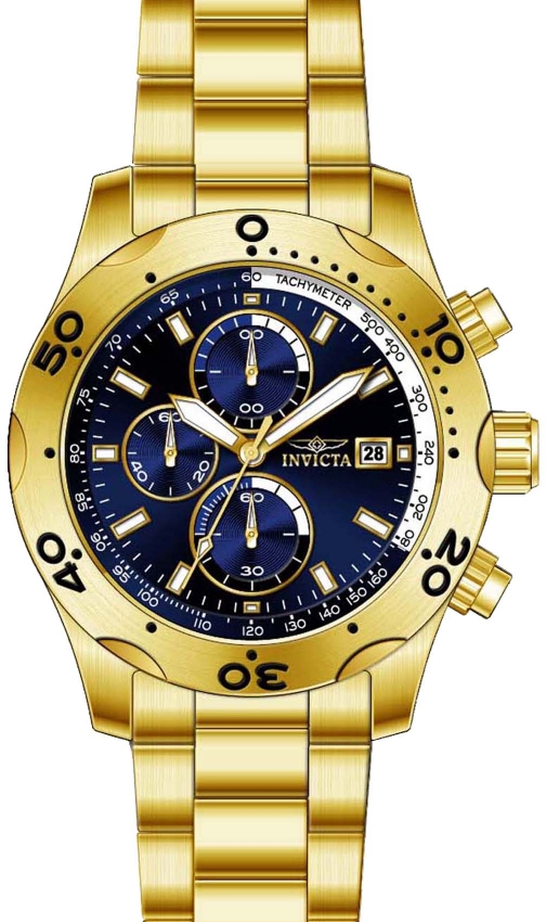 Gold-tone stainless steel case with a gold-tone stainless steel bracelet. Fixed gold-tone stainless steel bezel. Blue dial with luminous gold-tone sword-shaped hands and index hour markers. Minute markers. tachymeter markings around the outer rim. Dial Type: Analog. Luminescent hands and markers. Date display at the 3 o'clock position. Chronograph - sub-dials displaying: three - 60 second, 60 minute and 1/10th of a second. Hattori Caliber VD57 quartz movement. Scratch resistant flame fusion crystal. Screw down crown. Solid case back. Round case shape, case size: 45 mm, case thickness: 13 mm. Band width: 22 mm, band length: 8.8 inches. Fold over with safety release clasp. Water resistant at 50 meters / 165 feet. Functions: chronograph, date, hour, minute, second. Sport watch style. Watch label: Japan Movt. Invicta Specialty Chronograph Blue Dial Mens Watch 17751.