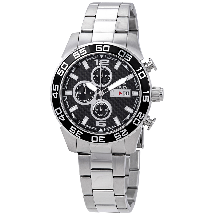 Stainless steel case with a stainless steel bracelet. Uni-directional rotating stainless steel with a black top ring bezel. Black carbon fiber dial with luminous silver-tone hands and index hour markers. Minute markers around the outer rim. Dial Type: Analog. Luminescent hands and markers. Date display at the 3 o'clock position. Chronograph - three sub-dials displaying: 60 second, 60 minute and 1/10th of a second. Hattori Caliber VD57 quartz movement. Scratch resistant flame fusion crystal. Pull / push crown. Solid case back. Round case shape, case size: 46 mm, case thickness: 13 mm. Band width: 22 mm. Fold over clasp. Water resistant at 100 meters / 330 feet. Functions: chronograph, date, hour, minute, second. Sport watch style. Watch label: Japan Movt. Invicta Specialty Chronograph Black Dial Mens Watch 21375.