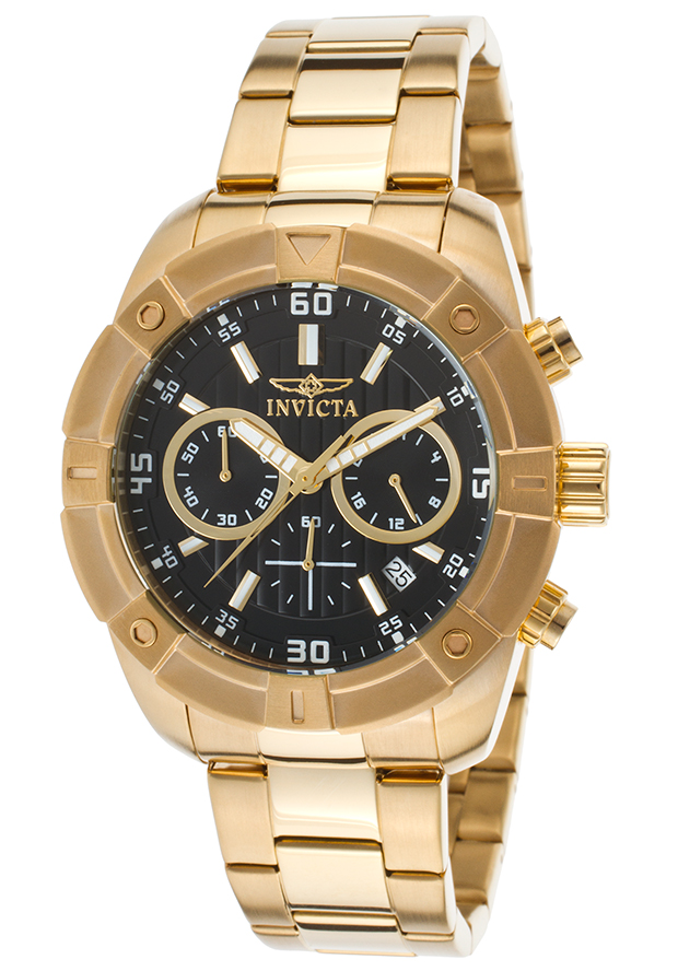 Gold-tone stainless steel case with a gold-tone stainless steel bracelet. Fixed gold-tone stainless steel bezel. Black dial with gold-tone hands and index hour markers. Minute markers around the outer rim. Dial Type: Analog. Luminescent hands and markers. Date display between 4 and 5 o'clock position. Chronograph - three sub-dials displaying: 60 second, 60 minute and 24 hour. Hattori Caliber VD53 quartz movement. Scratch resistant flame fusion crystal. Pull / push crown. Solid case back. Round case shape. Case size: 45 mm. Band width: 22 mm, band length: 8 inches. Fold over with safety release clasp. Water resistant at 100 meters / 330 feet. Functions: chronograph, date, GMT, second time zone, hour, minute, second. Sport watch style. Watch label: Japan Movt. Invicta Specialty Chronograph Black Dial Mens Watch 21470.