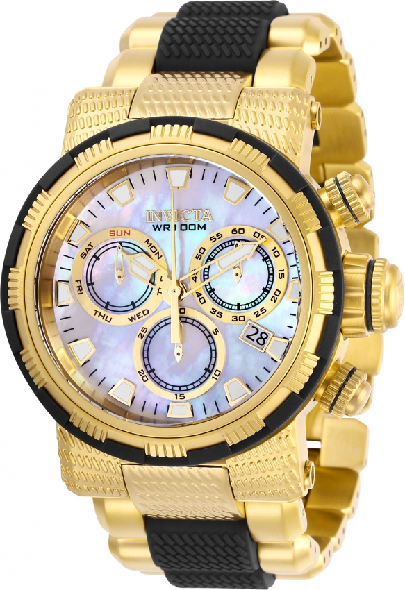 Yellow gold-tone stainless steel case with a yellow gold-tone stainless steel bracelet with black polyurethane center links. Fixed yellow gold-tone bezel with a black rim. White mother of pearl dial with luminous yellow gold-tone hands and index hour markers. Minute markers around the outer rim. Dial Type: Analog. Luminescent hands and markers. Date display at the 4 o'clock position. Chronograph - two sub-dials displaying: 60 second and 30 minute. Day of the week sub-dial. Ronda caliber Z60 quartz movement. Scratch resistant Flame Fusion crystal. Pull / push crown. Solid case back. Round case shape. Case size: 46 mm. Case thickness: 18.3 mm. Band width: 30 mm. Band length: 8.75 inches. Butterfly clasp. Water resistant at 100 meters / 330 feet. Functions: chronograph, date, day, hour, minute, small second. Specialty Series. Sport watch style. Watch label: Swiss Movt. Invicta Specialty Chronograph Quartz White Mother of Pearl Dial Mens Watch 28800.