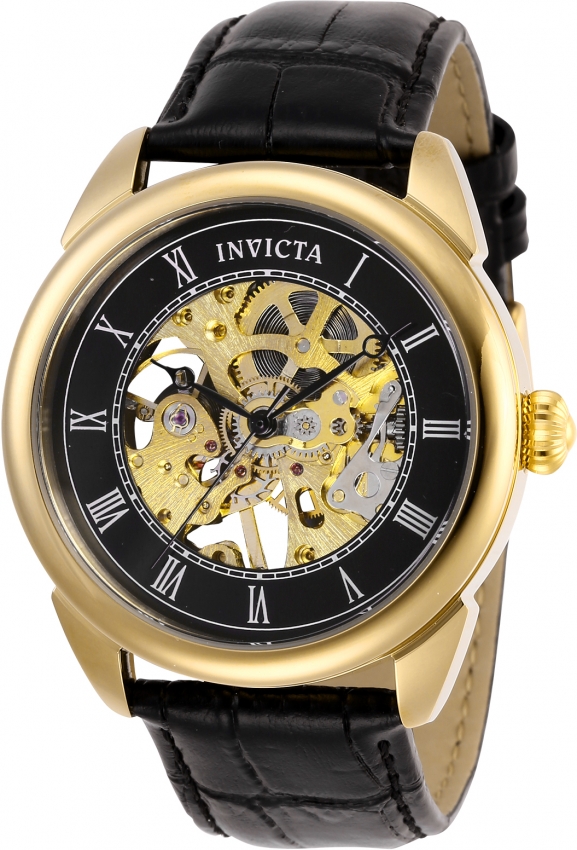 Yellow gold-tone stainless steel case with a black leather strap. Fixed yellow gold-tone stainless steel bezel. Black (skeleton center) dial with black hands and Roman numeral hour markers. Minute markers around an inner ring. Dial Type: Analog. Hong Tai Caliber JSD-006SJ mechanical movement with a 40-hour power reserve. Scratch resistant Flame Fusion crystal. Pull / push crown. Transparent case back. Round case shape, case size: 42 mm, case thickness: 12 mm. Band width: 22 mm. Tang clasp. Water resistant at 30 meters / 100 feet. Functions: hour, minute, second. Specialty Series. Casual watch style. Watch label: Chinese Movt. Invicta Specialty Mechanical Black Dial Mens Watch 28811.