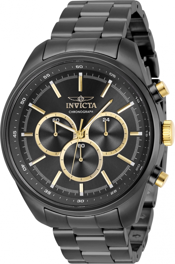 Gunmetal stainless steel case with a gunmetal stainless steel bracelet. Fixed gunmetal stainless steel bezel. Gunmetal dial with gold-tone hands and index hour markers. Minute markers around the outer rim. Dial Type: Analog. Luminescent hands and markers. Chronograph - three sub-dials displaying: 60 second, 60 minute and 24 hour. Hattori Caliber VD54 quartz movement. Scratch resistant flame fusion crystal. Pull / push crown. Solid case back. Round case shape, case size: 48 mm, case thickness: 13 mm. Band width: 22 mm, band length: 7.25 inches. Fold over clasp. Water resistant at 100 meters / 330 feet. Functions: chronograph, GMT, second time zone, hour, minute, second. Sport watch style. Watch label: Japan Movt. Invicta Specialty Chronograph Quartz Gunmetal Dial Mens Watch 29165.