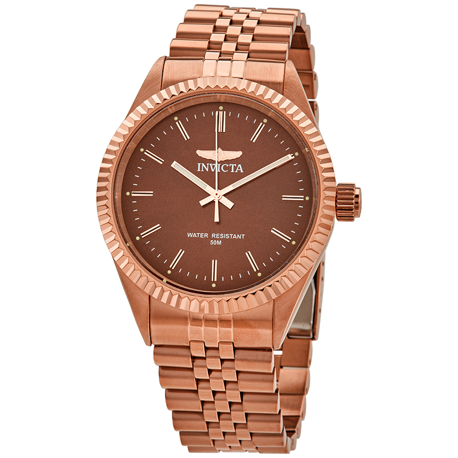 Rose gold-tone stainless steel case and bracelet. Fixed fluted rose gold-tone bezel. Brown dial with luminous rose gold-tone hands and index hour markers. Minute markers around the outer rim. Dial Type: Analog. Luminescent hands and markers. TMI caliber PC21J quartz movement. Scratch resistant mineral crystal. Pull / push crown. Solid case back. Round case shape. Case size: 43 mm. Case thickness: 10.5 mm. Band width: 22 mm. Band length: 8.25 inches. Fold over clasp. Water resistant at 50 meters / 165 feet. Functions: hour, minute, second. Specialty Series. Casual watch style. Watch label: Japan Movt. Invicta Specialty Quartz Brown Dial Rose Gold-tone Mens Watch 29393.