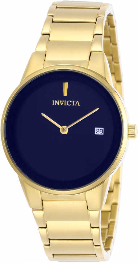 Gold-tone stainless steel case with a gold-tone stainless steel bracelet. Fixed gold-tone stainless steel bezel. Blue dial with gold-tone hands and index hour markers. Dial Type: Analog. Date display at the 3 o'clock position. Hattori Caliber VJ34 quartz movement. Scratch resistant mineral crystal. Pull / push crown. Solid case back. Round case shape, case size: 34 mm, case thickness: 9.7 mm. Band width: 18 mm, band length: 7.75 inches. Fold over clasp. Water resistant at 50 meters / 165 feet. Functions: date, hour, minute. Casual watch style. Watch label: Japan Movt. Invicta Specialty Quartz Blue Dial Ladies Watch 29487.