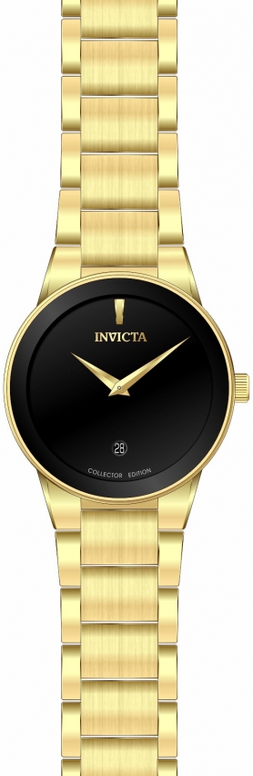 Gold-tone stainless steel case with a gold-tone stainless steel bracelet. Fixed gold-tone stainless steel bezel. Black dial with gold-tone dauphine-style shape hands and index hour markers. Dial Type: Analog. Date display at the 6 o'clock position. Hattori Caliber VJ34 quartz movement. Scratch resistant mineral crystal. Pull / push crown. Solid case back. Round case shape, case size: 36 mm, case thickness: 9.7 mm. Band width: 20 mm, band length: 7.75 inches. Butterfly clasp. Water resistant at 50 meters / 165 feet. Functions: date, hour, minute. Specialty Series. Casual watch style. Watch label: Japan Movt. Invicta Specialty Quartz Black Dial Ladies Watch 30539.
