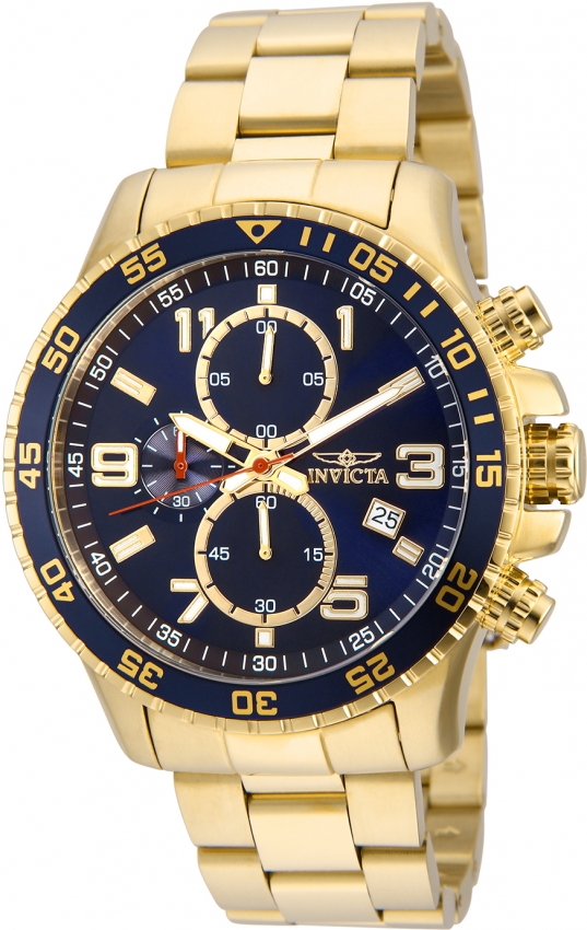 Gold-tone stainless steel case with a gold-tone stainless steel bracelet. Uni-directional rotating blue and gold stainless steel bezel. Blue dial with gold-tone hands and Arabic numeral and index hour markers. Minute markers around the outer rim. Dial Type: Analog. Luminescent hands and markers. Date display between 3 and 4 o'clock position. Chronograph - sub-dials displaying: three - 60 second, 60 minute and 1/10th of a second. Hattori Caliber VD57 quartz movement. Scratch resistant flame fusion crystal. Pull / push crown. Solid case back. Round case shape, case size: 45 mm, case thickness: 14 mm. Band width: 22 mm, band length: 7.25 inches. Fold over clasp. Water resistant at 100 meters / 330 feet. Functions: chronograph, date, hour, minute, second. Sport watch style. Watch label: Japan Movt. Invicta Specialty Chronograph Quartz Blue Dial Mens Watch 30689.