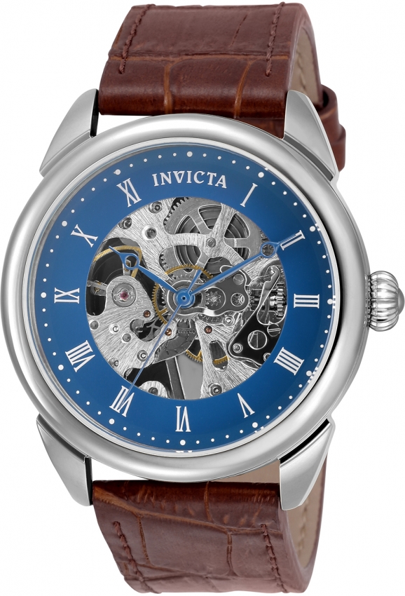 Stainless steel case with a brown leather strap. Fixed stainless steel bezel. Blue (skeleton center) dial with blue hands and Roman numeral hour markers. Minute markers around the outer rim. Dial Type: Analog. Caliber STBL-005BS(S.S.) mechanical movement. Scratch resistant flame fusion crystal. Pull / push crown. Transparent case back. Round case shape. Case size: 42 mm. Case thickness: 12 mm. Band width: 22 mm. Band length: 7.75 inches. Tang clasp. Water resistant at 30 meters / 100 feet. Functions: hour, minute, second. Casual watch style. Invicta Specialty Mechanical Blue Skeleton Dial Mens Watch 30723