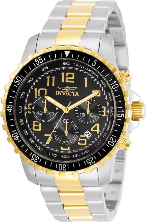 Silver-tone stainless steel case with a two-tone (silver-tone and gold-tone) stainless steel bracelet. Uni-directional rotating two-tone (black and gold-tone) stainless steel bezel. Black dial with gold-tone hands and Arabic numeral hour markers. Tachymeter scale around the outer rim. Dial Type: Analog. Luminescent hands and markers. Date display between 4 and 5 o'clock position. Chronograph - sub-dials displaying: three - 60 second, 60 minute and 24 hour. Hattori Caliber VD53 quartz movement. Scratch resistant flame fusion crystal. Pull / push crown. Solid case back. Round case shape, case size: 45.5 mm, case thickness: 13 mm. Band width: 22 mm, band length: 7.25 inches. Fold over clasp. Water resistant at 100 meters / 330 feet. Functions: chronograph, date, GMT, second time zone, hour, minute, second. Sport watch style. Watch label: Japan Movt. Invicta Specialty Chronograph Quartz Black Dial Mens Watch 30792.