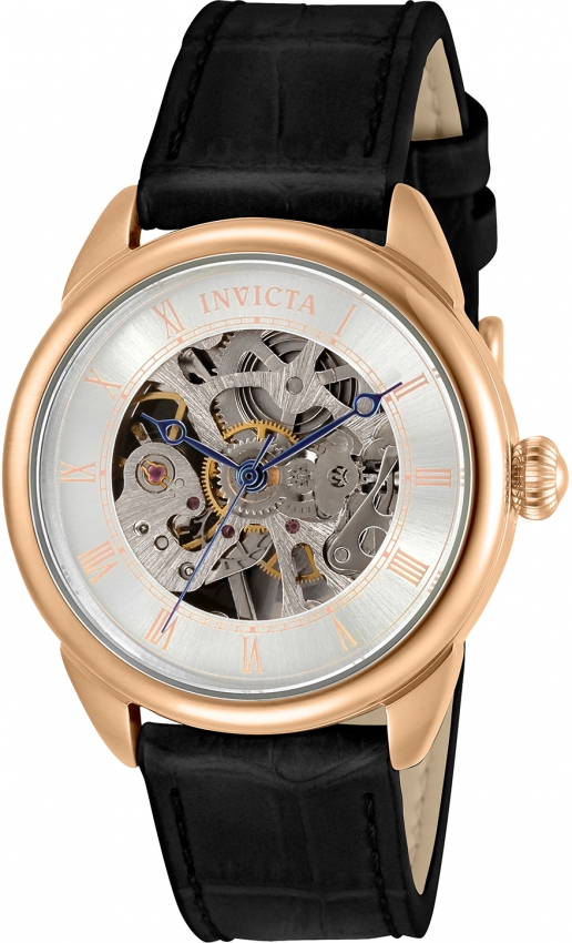 Rose gold-tone stainless steel case with a black leather strap. Fixed rose gold-tone bezel. Silver (skeleton center) dial with blue hands and Roman numeral hour markers. Minute markers. Dial Type: Analog. Caliber STBL-005BS(S.S.) automatic movement. Scratch resistant flame fusion crystal. Pull / push crown. Transparent case back. Round case shape. Case size: 36 mm. Case thickness: 12 mm. Band width: 18 mm. Band length: 7.5 inches. Tang clasp. Water resistant at 30 meters / 100 feet. Functions: hour, minute, second. Casual watch style. Invicta Specialty Automatic Silver Dial Ladies Watch 31152.
