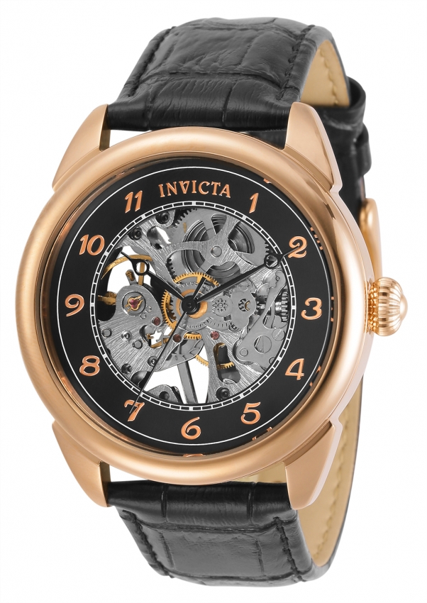 Rose gold-tone stainless steel case with a black leather strap. Fixed rose gold-tone bezel. Black (skeleton center) dial with black Breguet-style shape hands and Arabic numeral hour markers. Minute scale around an inner ring. Dial Type: Analog. Caliber STBL-005BS(S.S.) mechanical movement. Scratch resistant flame fusion crystal. Pull / push crown. Transparent case back. Round case shape. Case size: 42 mm. Case thickness: 12 mm. Band width: 42 mm. Band length: 7.75 inches. Tang clasp. Water resistant at 30 meters / 100 feet. Functions: hour, minute, second. Specialty Series. Casual watch style. Invicta Specialty Mechanical Black Dial Mens Watch 31309.