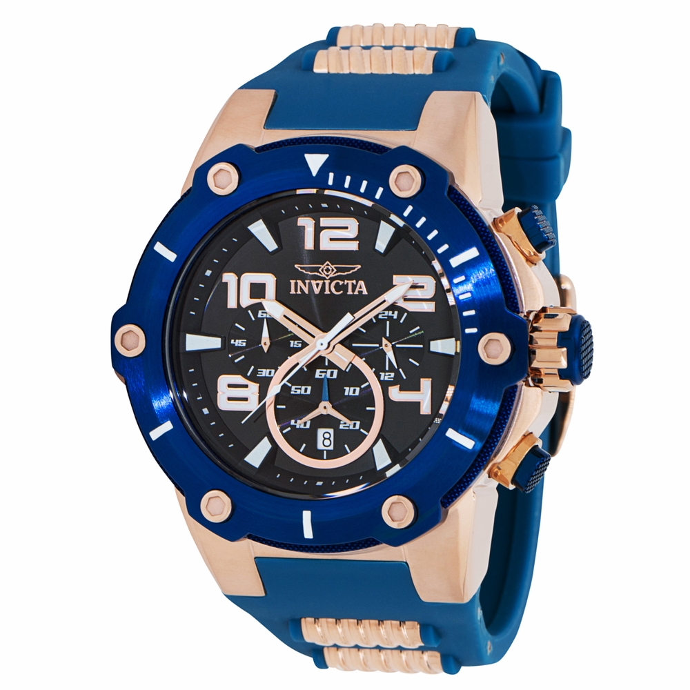 Black stainless steel case with a two-tone (blue and gold-tone) polyurethane strap. Fixed three-tone (rose gold and white and blue) stainless steel bezel. Black dial with rose gold-tone hands and index-Arabic numeral hour markers. Minute markers around the outer rim. Dial Type: Analog. Luminescent hands and markers. Date display at the 6 o'clock position. Chronograph - three sub-dials displaying: 60 second, 60 minute and 24 hour. Hattori Caliber VD53 quartz movement. Scratch resistant Flame Fusion crystal. Pull / push crown. Solid case back. Round case shape, case size: 50 mm, case thickness: 17.50 mm. Band width: 30 mm, band length: 8.25 inches. Buckle clasp. Water resistant at 100 meters / 330 feet. Functions: chronograph, date, GMT, second time zone, hour, minute, second. Speedway Series. Casual watch style. Watch label: Japan Movt. Invicta Speedway Chronograph Quartz Black Dial Mens Watch 40896.