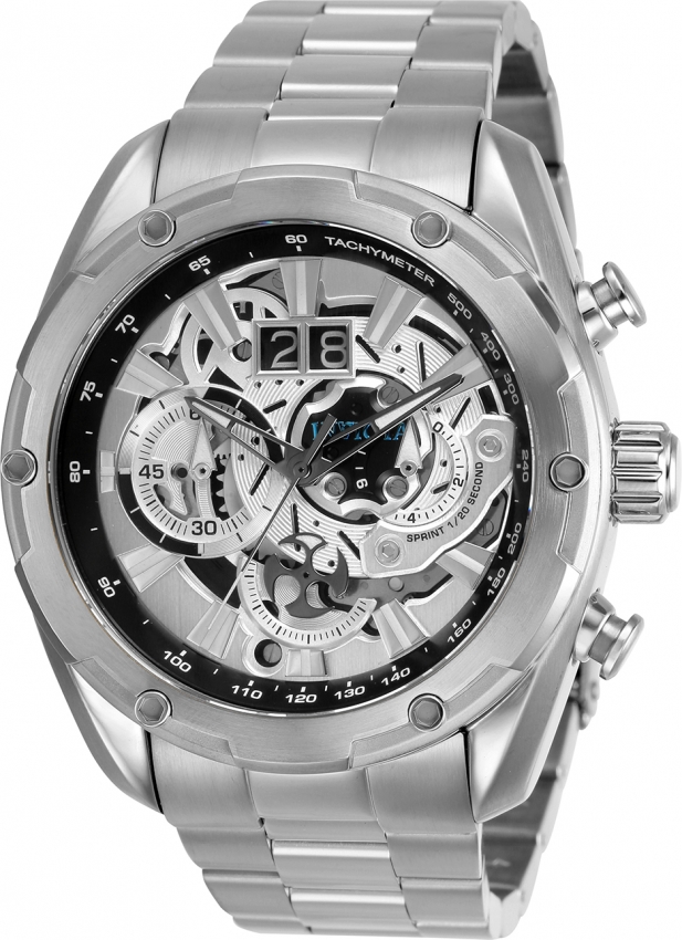 Stainless steel case with a stainless steel bracelet. Fixed stainless steel bezel. Silver dial with luminous silver-tone hands and index hour markers. Tachymeter scale around the outer rim. Dial Type: Analog. Luminescent hands and markers. Date display below the 12 o'clock position. Chronograph - three sub-dials displaying: 60 second, 60 minute and 1/20th of a second. Miyota Caliber 6S50 quartz movement. Scratch resistant flame fusion crystal. Pull / push crown. Solid case back. Round case shape. Case size: 50 mm. Case thickness: 16.5 mm. Band width: 26 mm. Band length: 7.25 inches. Fold over clasp. Water resistant at 100 meters / 330 feet. Functions: chronograph, big date, hour, minute, second. Speedway Series. Sport watch style. Watch label: Japan Movt. Invicta Speedway Chronograph Quartz Silver Dial Mens Watch 30036.