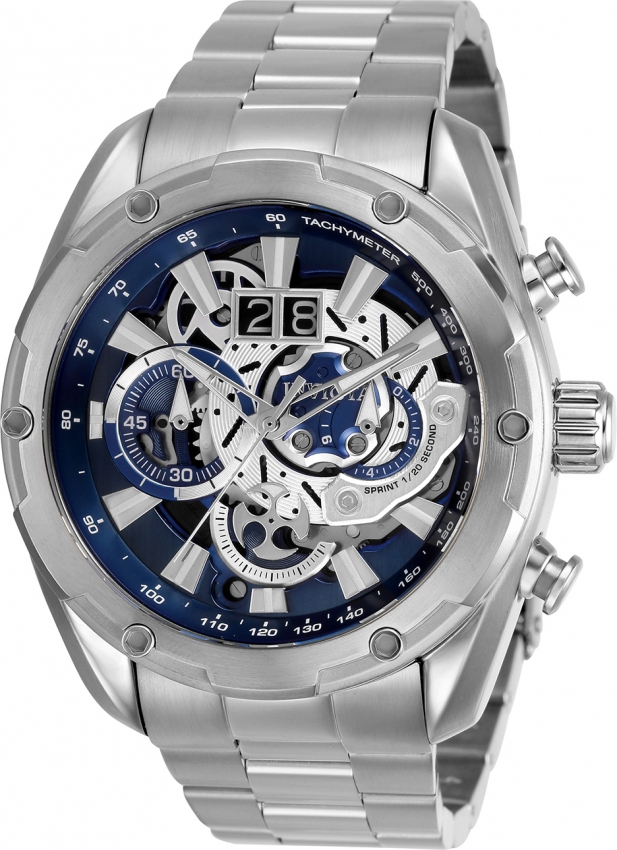 Stainless steel case with a stainless steel bracelet. Fixed stainless steel bezel. Blue dial with luminous silver-tone hands and index hour markers. Tachymeter scale around the outer rim. Dial Type: Analog. Luminescent hands and markers. Date display at the 12 o'clock position. Chronograph - three sub-dials displaying: 60 second, 60 minute and 1/20th of a second. Miyota caliber 6S50 quartz movement. Scratch resistant flame fusion crystal. Pull / push crown. Solid case back. Round case shape. Case size: 50 mm. Case thickness: 16.5 mm. Band width: 26 mm. Band length: 7.25 inches. Fold over clasp. Water resistant at 100 meters / 330 feet. Functions: chronograph, big date, hour, minute, second. Sport watch style. Watch label: Japan Movt. Invicta Speedway Chronograph Quartz Blue Dial Mens Watch 30037.