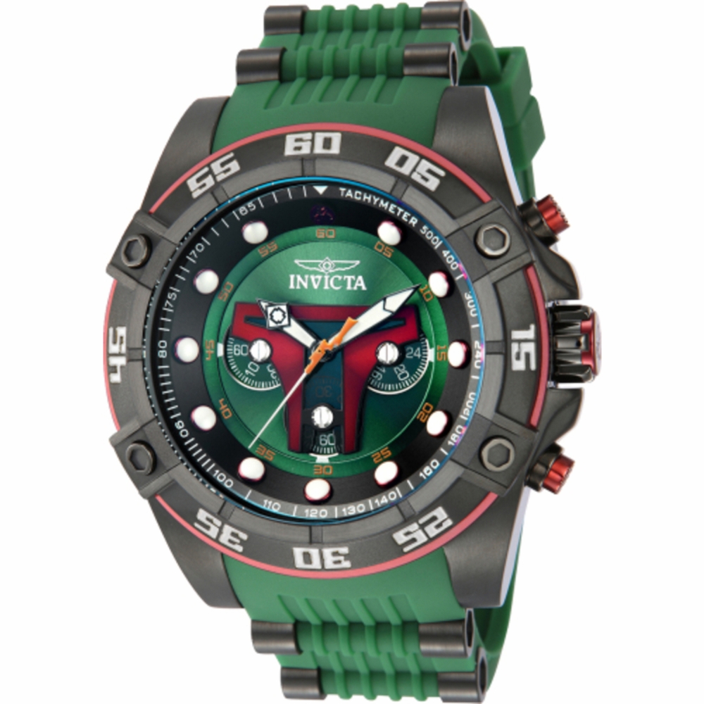 Black stainless steel case with a two-tone (green and black) silicone and stainless steel strap. Three-tone (white and red and black) stainless steel bezel. Green and red and black dial with silver-tone hands and index hour markers. Tachymeter scale around the outer rim. Dial Type: Analog. Luminescent hands and markers. Chronograph - three sub-dials displaying: 60 second, 60 minute and 24 hour. Hattori Caliber VD54 quartz movement. Scratch resistant Flame Fusion crystal. Pull / push crown. Solid case back. Round case shape, case size: 52 mm, case thickness: 19 mm. Band width: 26 mm, band length: 7.75 inches. Buckle clasp. Water resistant at 100 meters / 330 feet. Functions: chronograph, GMT, second time zone, hour, minute, second. Star Wars Series. Casual watch style. Watch label: Japan Movt. Invicta Star Wars Boba Fett Chronograph Quartz Mens Watch 40092.