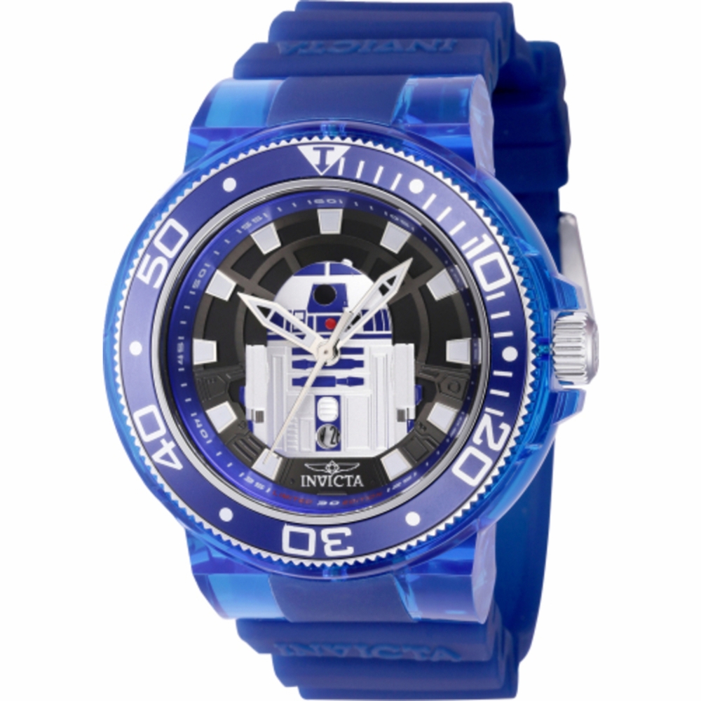 Blue stainless steel case with a blue silicone strap. Uni-directional rotating silver-tone and blue and silver stainless steel and aluminum bezel. Black dial with silver-tone hands and index hour markers. Minute markers around the outer rim. Dial Type: Analog. Luminescent hands and markers. Date display at the 6 o'clock position. Hattori Caliber PC32 quartz movement. Scratch resistant mineral crystal. Pull / push crown. Solid case back. Round case shape, case size: 51.5 mm, case thickness: 16.65 mm. Band width: 30 mm, band length: 8.25 inches. Fold over clasp. Water resistant at 100 meters / 330 feet. Functions: date, hour, minute, second. Star Wars Series. Casual watch style. Watch label: Japan Movt. Invicta Star Wars R2-D2 Quartz Black Dial Mens Watch 39710.
