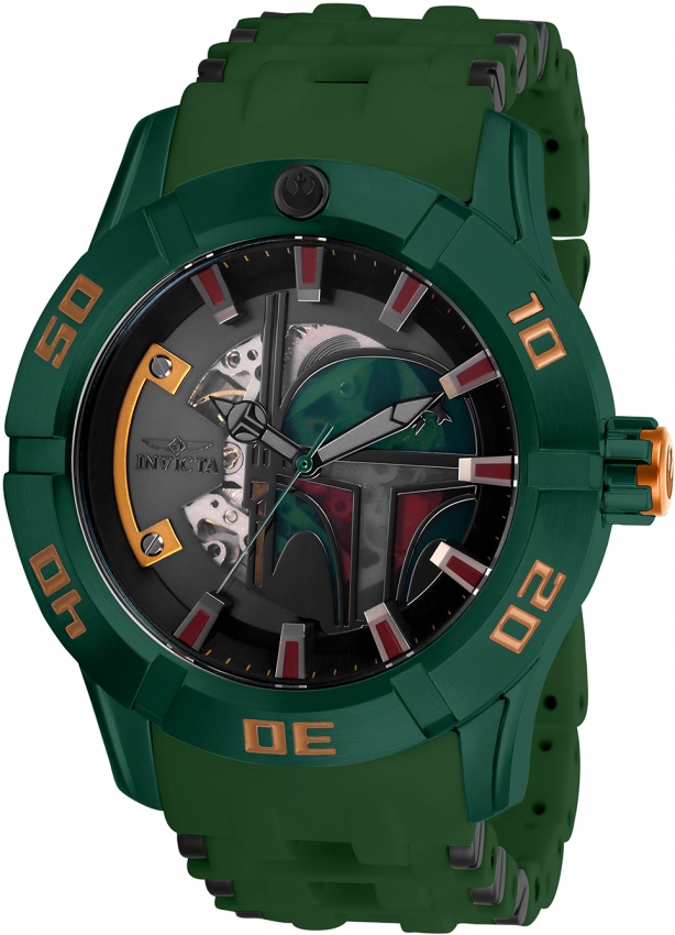 Green ion-plated stainless steel case with a green polyurethane strap with stainless steel barrel inserts. Uni-directional rotating green ion-plated stainless steel bezel. Green dial with luminous black hands and index hour markers. Minute markers. Dial Type: Analog. Luminescent hands. Caliber G2665Z automatic movement. Scratch resistant flame fusion crystal. Pull / push crown. Solid case back. Round case shape. Case size: 50 mm. Case thickness: 17 mm. Band width: 26 mm. Band length: 7.75 inches. Fold over clasp. Water resistant at 100 meters / 330 feet. Functions: hour, minute, second. Additional Info: star wars limited edition boba fett. in general, suitable for swimming and snorkeling, but not diving. Casual watch style. Invicta Star Wars Boba Fett Automatic Green Dial Mens Watch 26545.