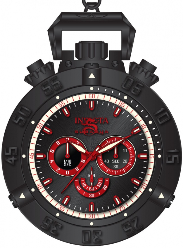 Black stainless steel case. Fixed black stainless steel bezel. Black dial with red hands and index hour markers. Minute markers around the outer rim. Dial Type: Analog. Luminescent hands and markers. Chronograph - three sub-dials displaying: 60 second, 60 minute and 1/10th of a second. Hattori Caliber VD55 quartz movement. Scratch resistant mineral crystal. Pull / push crown. Solid case back. Round case shape, case size: 56 mm. Water resistant at 100 meters / 330 feet. Functions: chronograph, hour, minute, second. Subaqua Series. Sport watch style. Watch label: Japan Movt. Invicta Subaqua Chronograph Quartz Black Dial Mens Pocket Watch 34690.