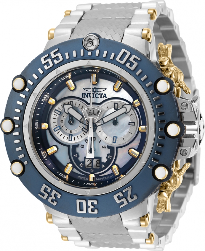 Gold and dark blue and silver-tone stainless steel case with a two-tone (silver-tone and gold-tone) stainless steel bracelet. Uni-directional rotating gold and silver-tone and dark blue stainless steel bezel. Blue and platinum dial with blue hands and index hour markers. Minute markers around the outer rim. Dial Type: Analog. Luminescent hands and markers. Date display at the 6 o'clock position. Chronograph - three sub-dials displaying: 60 second, dual 12 hour / 30 minute and 1/10th of a second. Ronda Caliber 5050.C quartz movement. Scratch resistant Flame Fusion crystal. Screw down crown. Solid case back. Round case shape, case size: 52 mm, case thickness: 18.6 mm. Band width: 27.3 mm, band length: 9 inches. Fold over clasp. Water resistant at 200 meters / 660 feet. Functions: chronograph, big date, day, hour, minute, small second. Subaqua Series. Sport watch style. Watch label: Swiss Movt. Invicta Subaqua Chronograph Quartz Mens Watch 32121.