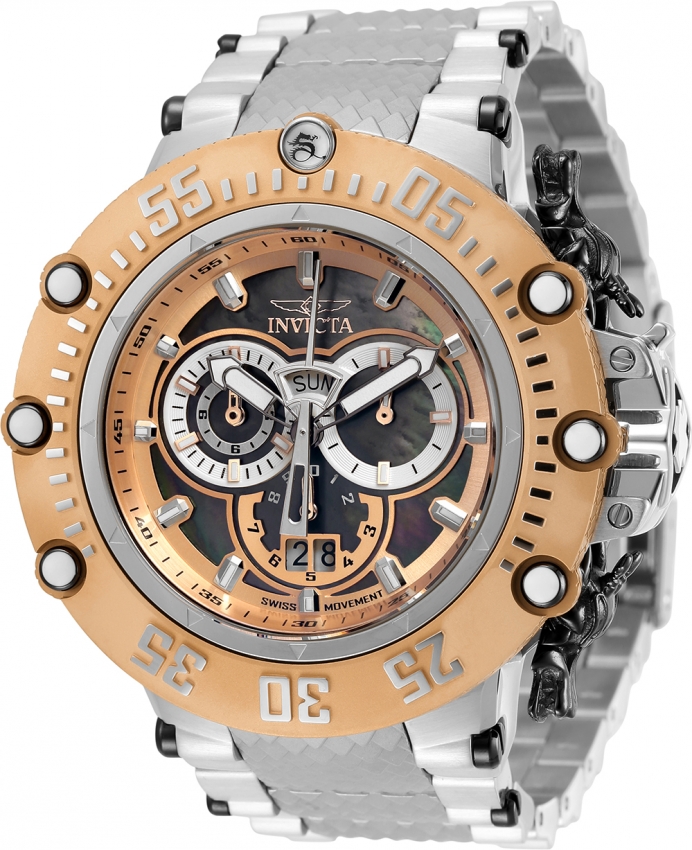 Rose gold and black and silver-tone stainless steel case with a two-tone (silver-tone and black) stainless steel bracelet. Uni-directional rotating black and silver-tone and rose gold stainless steel bezel. Black and rose gold dial with gold-tone hands and index hour markers. Minute markers around the outer rim. Dial Type: Analog. Luminescent hands and markers. Date display at the 6 o'clock position. Chronograph - three sub-dials displaying: 60 second, dual 12 hour / 30 minute and 1/10th of a second. Ronda Caliber 5050.C quartz movement. Scratch resistant Flame Fusion crystal. Screw down crown. Solid case back. Round case shape, case size: 52 mm, case thickness: 18.6 mm. Band width: 27.3 mm, band length: 9 inches. Fold over clasp. Water resistant at 200 meters / 660 feet. Functions: chronograph, big date, day, hour, minute, small second. Subaqua Series. Sport watch style. Watch label: Swiss Movt. Invicta Subaqua Chronograph Quartz Mens Watch 32122.