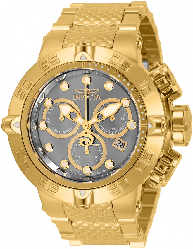 Gold-tone stainless steel case and bracelet. Uni-directional rotating gold-tone stainless steel bezel. Silver and gold dial with gold-tone hands and index hour markers. Minute markers around the outer rim. Dial Type: Analog. Luminescent hands and markers. Date display at the 4 o'clock position. Three sub-dials displaying: day, 60 second and 30 minute. Ronda Caliber Z60 quartz movement. Scratch resistant Flame Fusion crystal. Screw down crown. Solid case back. Round case shape, case size: 50 mm, case thickness: 18 mm. Band width: 28 mm, band length: 8.25 inches. Fold over clasp. Water resistant at 500 meters / 1650 feet. Functions: chronograph, date, day, hour, minute, small second. Subaqua Series. Dive watch style. Watch label: Swiss Movt. Invicta Subaqua Chronograph Quartz Mens Watch 32973.