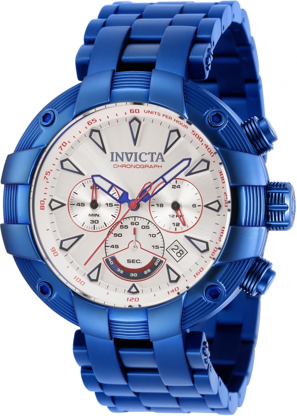 Blue stainless steel case and bracelet. Fixed blue stainless steel bezel. Silver-tone dial with blue hands and index hour markers. Tachymeter scale around the outer rim. Dial Type: Analog. Luminescent hands and markers. Date display between 4 and 5 o'clock position. Chronograph - three sub-dials displaying: 60 second, 60 minute and 24 hour. Hattori Caliber VD53 quartz movement. Scratch resistant Flame Fusion crystal. Screw down crown. Solid case back. Round case shape, case size: 48 mm, case thickness: 15 mm. Band width: 24 mm, band length: 8.75 inches. Fold over clasp. Water resistant at 200 meters / 660 feet. Functions: chronograph, date, GMT, second time zone, hour, minute, second. Subaqua Series. Sport watch style. Watch label: Japan Movt. Invicta Subaqua Chronograph Quartz Silver Dial Mens Watch 32218.