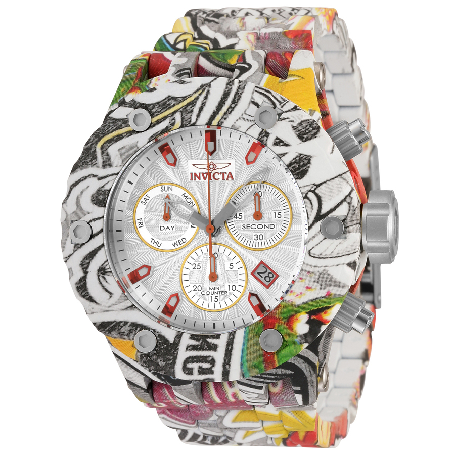 Silver-tone and aqua-plating stainless steel case with a silver-tone and aqua plating stainless steel bracelet. Uni-directional rotating silver-tone and aqua-plating stainless steel bezel. Silver-tone dial with silver-tone hands and index hour markers. Minute markers around the outer rim. Dial Type: Analog. Luminescent hands and markers. Date display between 4 and 5 o'clock position. Three sub-dials displaying: day, 60 second and 30 minute. Ronda Caliber Z60 quartz movement. Scratch resistant mineral crystal. Screw down crown. Solid case back. Round case shape, case size: 52 mm, case thickness: 17.55 mm. Band width: 31 mm, band length: 8.25 inches. Fold over clasp. Water resistant at 500 meters / 1650 feet. Functions: chronograph, date, day, hour, minute, small second. Subaqua Series.