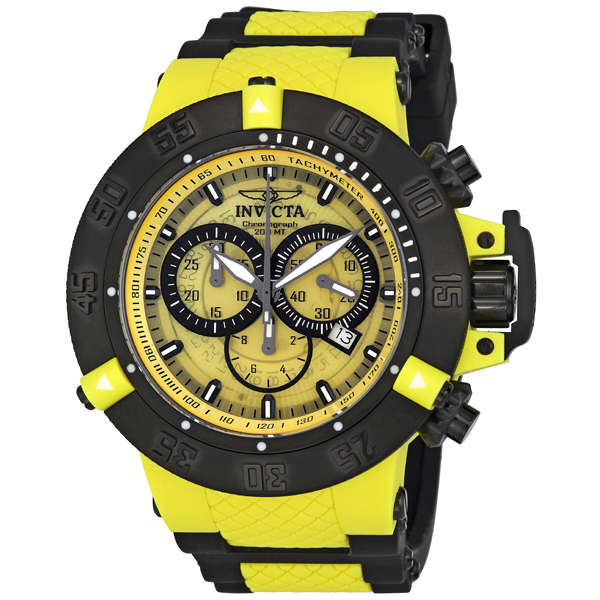 Black plastic case with a black and yellow rubber strap. Uni-directional rotating black ion-plated bezel. Yellow transparent dial with silver-tone sword-shaped hands and index hour markers. Minute markers. Tachymeter markings around the outer rim. Dial Type: Analog. Luminescent hands and markers. Date display at the 4 o'clock position. Chronograph - three sub-dials displaying: 30 minute, 60 second, 1/10th of a second. Ronda caliber 5040.D quartz movement. Scratch resistant flame fusion crystal. Screw down crown with a protective cover. Stainless steel case back. Round case shape. Case size: 50 mm. Case thickness: 17 mm. Band width: 28 mm. Band length: 10 inches. Tang clasp. Water resistant at 200 meters / 660 feet. Functions: anatomic chronograph. Subaqua Noma IIi Series. Sport watch style. Invicta Subaqua Noma III Anatomic Chronograph Mens Watch 0934.