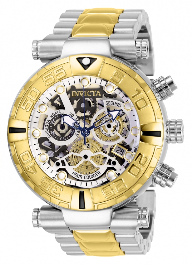 Two-tone (silver-tone and gold-tone) stainless steel case with a two-tone (silver-tone and gold-tone) stainless steel bracelet. Fixed arabic numeral gold-tone stainless steel bezel. Silver and gold and gunmetal dial with blue skeleton alpha-style shape hands and dot hour markers. Minute markers around the outer rim. Dial Type: Analog. Date display at the 4 o'clock position. Chronograph - sub-dials displaying: three - 60 second, 30 minute and 12 hour. Ronda Caliber 5030.D quartz movement. Scratch resistant flame fusion crystal. Pull / push crown. Solid case back. Round case shape, case size: 47 mm, case thickness: 19 mm. Band width: 24 mm, band length: 7.75 inches. Fold over clasp. Water resistant at 200 meters / 660 feet. Functions: chronograph, date, hour, minute, small second. Sport watch style. Watch label: Swiss Movt. Invicta Subaqua Chronograph Quartz Mens Watch 26295.