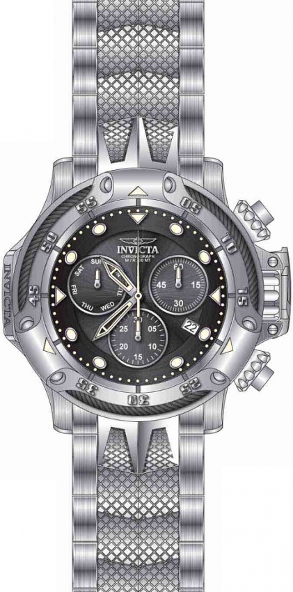 Silver-tone stainless steel case with a silver-tone stainless steel bracelet. Uni-directional rotating silver-tone stainless steel bezel. Black dial with silver-tone hands and index hour markers. Minute markers around the outer rim. Dial Type: Analog. Luminescent hands and markers. Date display at the 4 o'clock position. Chronograph - three sub-dials displaying: week, 60 second, 30 minute. Ronda Caliber Z60 quartz movement. Scratch resistant mineral crystal. Screw down crown. Solid case back. Round case shape. Case size: 55.5 mm. Band width: 26 mm, band length: 8.25 inches. Deployment clasp. Water resistant at 200 meters / 660 feet. Functions: chronograph, date, day, hour, minute, small second. Sport watch style. Watch label: Swiss Movt. Invicta Subaqua Chronograph Black Dial Mens Watch 26720.
