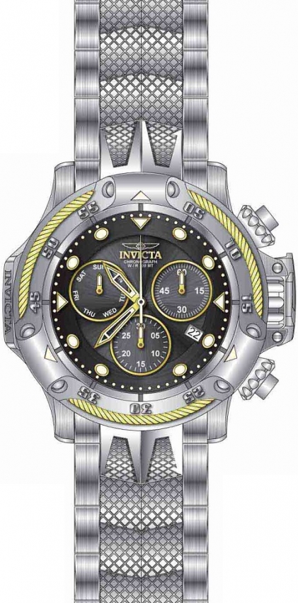 Silver-tone stainless steel case with a silver-tone stainless steel bracelet. Uni-directional rotating yellow stainless steel bezel. Black dial with silver-tone hands and index hour markers. Minute markers around the outer rim. Dial Type: Analog. Luminescent hands and markers. Date display at the 4 o'clock position. Chronograph - sub-dials displaying: three - week, 60 second, 30 minute. Ronda Caliber Z60 quartz movement. Scratch resistant mineral crystal. Screw down crown. Solid case back. Round case shape. Case size: 55.5 mm. Band width: 26 mm, band length: 8.25 inches. Deployment clasp. Water resistant at 200 meters / 660 feet. Functions: chronograph, date, day, hour, minute, small second. Sport watch style. Watch label: Swiss Movt. Invicta Subaqua Chronograph Black Dial Mens Watch 26721.