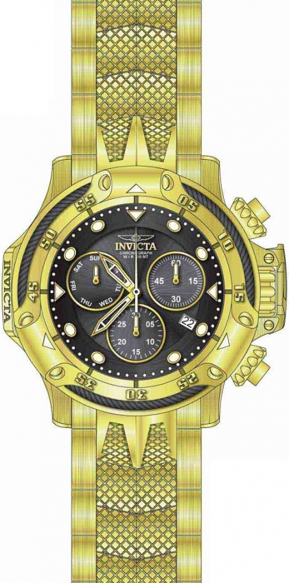 Yellow gold-plated stainless steel case and bracelet. Uni-directional rotating yellow gold-plated bezel with black cabel wire trim. Black dial with yellow gold-tone skeleton hands and dot hour markers. Minute markers around the outer rim. Dial Type: Analog. Luminescent hands and markers. Date display at the 4 o'clock position. Chronograph - two sub-dials displaying: 60 second and 30 minute. Day of the week sub-dial. Ronda caliber Z60 quartz movement. Scratch resistant mineral crystal. Screw down crown. Solid case back. Round case shape. Case size: 55.45 mm. Case thickness: 18 mm. Band width: 26 mm. Band length: 8 inches. Fold over clasp. Water resistant at 200 meters / 660 feet. Functions: chronograph, date, day, hour, minute, small second. Sport watch style. Watch label: Swiss Movt. Invicta Subaqua Chronograph Black Dial Mens Watch 26724.