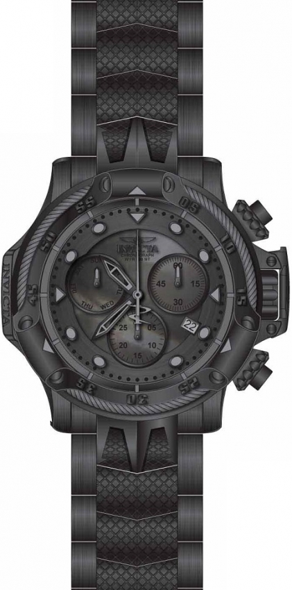 Black stainless steel case with a black stainless steel bracelet. Uni-directional rotating black and dark cray bezel. Dark grey dial with black hands and dot hour markers. Minute markers around the outer rim. Dial Type: Analog. Luminescent hands and markers. Date display at the 4 o'clock position. Chronograph - three sub-dials displaying: week, 60 second, 30 minute. Ronda Caliber Z60 quartz movement. Scratch resistant mineral crystal. Screw down crown. Solid case back. Round case shape. Case size: 55.45 mm. Band width: 26 mm, band length: 8 inches. Deployment with safety release clasp. Water resistant at 200 meters / 660 feet. Functions: chronograph, date, day, hour, minute, small second. Sport watch style. Watch label: Swiss Movt. Invicta Subaqua Chronograph Dark Grey Dial Mens Watch 26729.