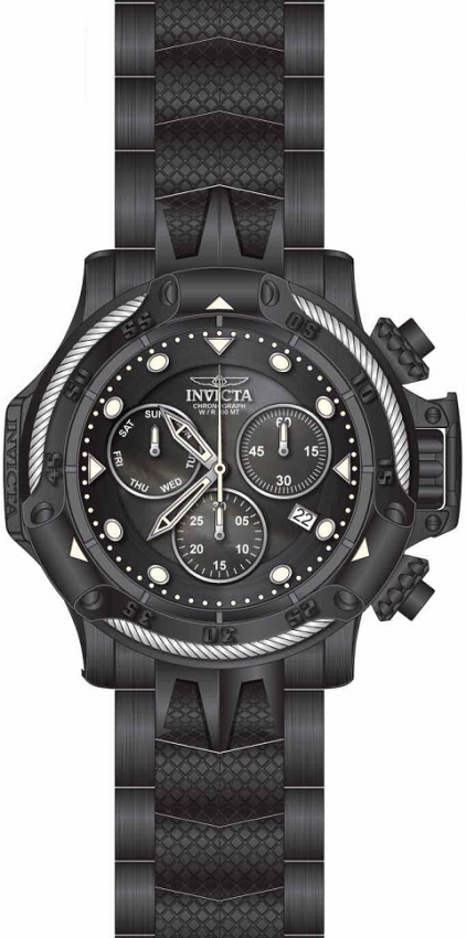 Black stainless steel case with a black stainless steel bracelet. Fixed black stainless steel bezel. Black dial with silver-tone hands and dot hour markers. Minute markers around the outer rim. Dial Type: Analog. Luminescent hands and markers. Date display at the 4 o'clock position. Chronograph - sub-dials displaying: three - week, 60 second, 30 minute day of the week. Ronda Caliber Z60 quartz movement. Scratch resistant mineral crystal. Screw down crown. Solid case back. Round case shape. Case size: 55.45. Band width: 26 mm, band length: 8 inches. Deployment with safety clasp. Water resistant at 200 meters / 660 feet. Functions: chronograph, date, day, hour, minute, small second. Sport watch style. Watch label: Swiss Movt. Invicta Subaqua Chronograph Black Dial Mens Watch 26730.