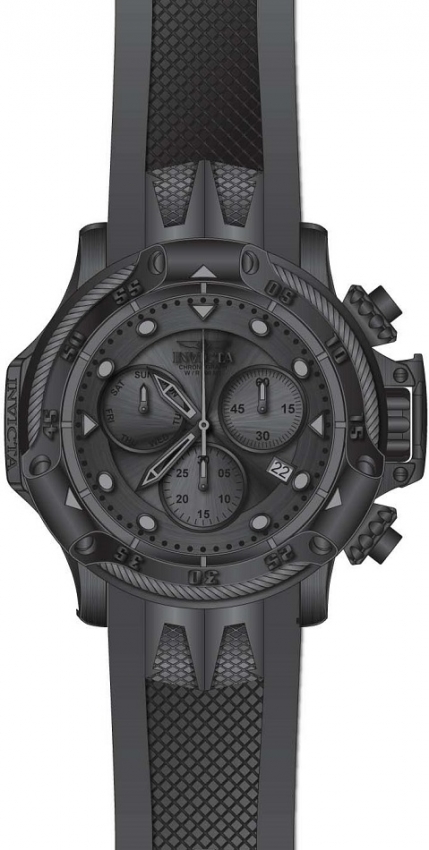 Black stainless steel case with a black silicone and stainless steel strap. Uni-directional rotating black stainless steel and cable bezel. Black dial with black hands and index hour markers. Minute markers around the outer rim. Dial Type: Analog. Luminescent hands and markers. Date display at the 4 o'clock position. Chronograph - sub-dials displaying: three - week, 60 second, 30 minute. Ronda Caliber Z60 quartz movement. Scratch resistant mineral crystal. Screw down crown. Solid case back. Round case shape, case size: 55 mm, case thickness: 18 mm. Band width: 26 mm, band length: 8.5 inches. Buckle clasp. Water resistant at 200 meters / 660 feet. Functions: chronograph, date, day, hour, minute, small second. Sport watch style. Watch label: Swiss Movt. Invicta Subaqua Chronograph Black Dial Mens Watch 26969.